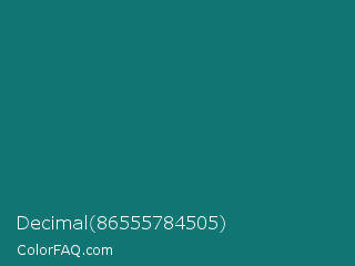 Decimal 86555784505 Color is a dark cyan color and the nearest color is Genoa #15736b. Hex code #117573 and RGB value is rgb(17,117,115). In RGB color space, this color is composed of 7% red, 46% green, 45% blue, In CMYK color space, this color is composed of 85% cyan, 0% magenta, 2% yellow , 54% black , In HSL color space, this color has a hue angle of 179° , 75% saturation and 26% lightness.