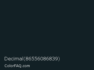 Decimal 86556086839 Color is a very dark blue color and the nearest color is Mirage #161928. Hex code #122025 and RGB value is rgb(18,32,37). In RGB color space, this color is composed of 7% red, 13% green, 15% blue, In CMYK color space, this color is composed of 51% cyan, 14% magenta, 0% yellow , 85% black , In HSL color space, this color has a hue angle of 196° , 35% saturation and 11% lightness.