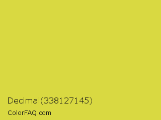 Decimal 338127145 Color is a normal yellow color and the nearest color is Wattle #dcd747. Hex code #d9d941 and RGB value is rgb(217,217,65). In RGB color space, this color is composed of 85% red, 85% green, 25% blue, In CMYK color space, this color is composed of 0% cyan, 0% magenta, 70% yellow , 15% black , In HSL color space, this color has a hue angle of 60° , 67% saturation and 55% lightness.