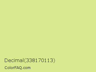 Decimal 338170113 Color is a light yellow color and the nearest color is Key Lime #e8f48c. Hex code #d9e98d and RGB value is rgb(217,233,141). In RGB color space, this color is composed of 85% red, 91% green, 55% blue, In CMYK color space, this color is composed of 7% cyan, 0% magenta, 39% yellow , 9% black , In HSL color space, this color has a hue angle of 70° , 68% saturation and 73% lightness.