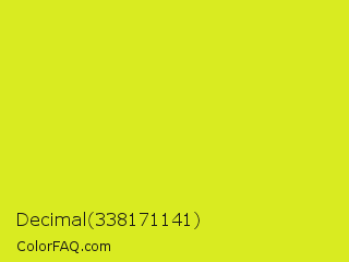 Decimal 338171141 Color is a normal yellow color and the nearest color is Piss Yellow #e1e115. Hex code #d9eb21 and RGB value is rgb(217,235,33). In RGB color space, this color is composed of 85% red, 92% green, 13% blue, In CMYK color space, this color is composed of 8% cyan, 0% magenta, 86% yellow , 8% black , In HSL color space, this color has a hue angle of 65° , 83% saturation and 53% lightness.