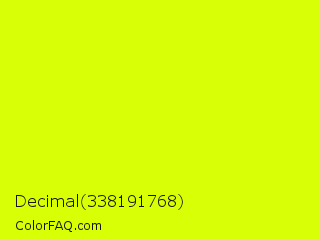 Decimal 338191768 Color is a normal yellow color and the nearest color is Chartreuse Yellow #dfff00. Hex code #d9ff06 and RGB value is rgb(217,255,6). In RGB color space, this color is composed of 85% red, 100% green, 2% blue, In CMYK color space, this color is composed of 15% cyan, 0% magenta, 98% yellow , 0% black , In HSL color space, this color has a hue angle of 69° , 100% saturation and 51% lightness.