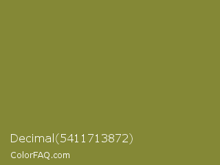 Decimal 5411713872 Color is a normal yellow color and the nearest color is Old Moss Green #867e36. Hex code #848836 and RGB value is rgb(132,136,54). In RGB color space, this color is composed of 52% red, 53% green, 21% blue, In CMYK color space, this color is composed of 3% cyan, 0% magenta, 60% yellow , 47% black , In HSL color space, this color has a hue angle of 63° , 43% saturation and 37% lightness.