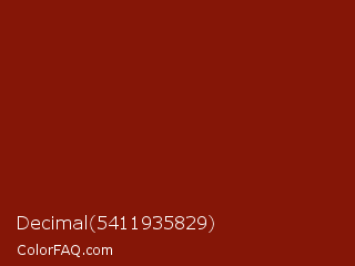 Decimal 5411935829 Color is a dark red color and the nearest color is Kenyan Copper #7c1c05. Hex code #851607 and RGB value is rgb(133,22,7). In RGB color space, this color is composed of 52% red, 9% green, 3% blue, In CMYK color space, this color is composed of 0% cyan, 83% magenta, 95% yellow , 48% black , In HSL color space, this color has a hue angle of 7° , 90% saturation and 27% lightness.