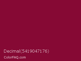 Decimal 5419047176 Color is a dark rose color and the nearest color is Siren #7a013a. Hex code #860934 and RGB value is rgb(134,9,52). In RGB color space, this color is composed of 53% red, 4% green, 20% blue, In CMYK color space, this color is composed of 0% cyan, 93% magenta, 61% yellow , 47% black , In HSL color space, this color has a hue angle of 339° , 87% saturation and 28% lightness.