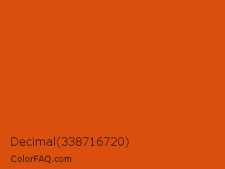 Decimal 338716720 Color is a normal orange color and the nearest color is Trinidad #e64e03. Hex code #da4e0e and RGB value is rgb(218,78,14). In RGB color space, this color is composed of 85% red, 31% green, 5% blue, In CMYK color space, this color is composed of 0% cyan, 64% magenta, 94% yellow , 15% black , In HSL color space, this color has a hue angle of 19° , 88% saturation and 45% lightness.