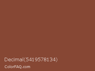 Decimal 5419578134 Color is a normal red color and the nearest color is Mule Fawn #8c472f. Hex code #874734 and RGB value is rgb(135,71,52). In RGB color space, this color is composed of 53% red, 28% green, 20% blue, In CMYK color space, this color is composed of 0% cyan, 47% magenta, 61% yellow , 47% black , In HSL color space, this color has a hue angle of 14° , 44% saturation and 37% lightness.