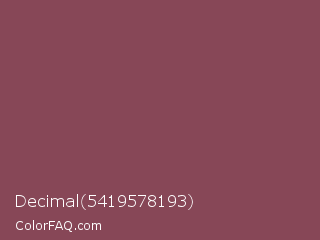 Decimal 5419578193 Color is a normal red color and the nearest color is Deep Ruby #843f5b. Hex code #874757 and RGB value is rgb(135,71,87). In RGB color space, this color is composed of 53% red, 28% green, 34% blue, In CMYK color space, this color is composed of 0% cyan, 47% magenta, 36% yellow , 47% black , In HSL color space, this color has a hue angle of 345° , 31% saturation and 40% lightness.