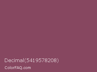 Decimal 5419578208 Color is a normal rose color and the nearest color is Cannon Pink #894367. Hex code #874760 and RGB value is rgb(135,71,96). In RGB color space, this color is composed of 53% red, 28% green, 38% blue, In CMYK color space, this color is composed of 0% cyan, 47% magenta, 29% yellow , 47% black , In HSL color space, this color has a hue angle of 337° , 31% saturation and 40% lightness.