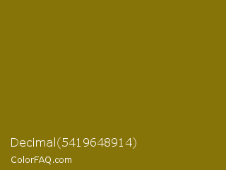 Decimal 5419648914 Color is a dark yellow color and the nearest color is Corn Harvest #8b6b0b. Hex code #877408 and RGB value is rgb(135,116,8). In RGB color space, this color is composed of 53% red, 45% green, 3% blue, In CMYK color space, this color is composed of 0% cyan, 14% magenta, 94% yellow , 47% black , In HSL color space, this color has a hue angle of 51° , 89% saturation and 28% lightness.