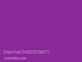 Decimal 5420355607 Color is a normal purple color and the nearest color is Vivid Violet #803790. Hex code #882899 and RGB value is rgb(136,40,153). In RGB color space, this color is composed of 53% red, 16% green, 60% blue, In CMYK color space, this color is composed of 11% cyan, 74% magenta, 0% yellow , 40% black , In HSL color space, this color has a hue angle of 291° , 59% saturation and 38% lightness.