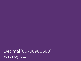 Decimal 86730900583 Color is a normal purple color and the nearest color is Imperial #602f6b. Hex code #593073 and RGB value is rgb(89,48,115). In RGB color space, this color is composed of 35% red, 19% green, 45% blue, In CMYK color space, this color is composed of 23% cyan, 58% magenta, 0% yellow , 55% black , In HSL color space, this color has a hue angle of 277° , 41% saturation and 32% lightness.