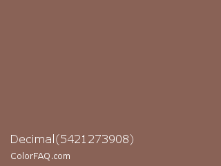 Decimal 5421273908 Color is a normal red color and the nearest color is Dark Brown Tangelo #88654e. Hex code #896256 and RGB value is rgb(137,98,86). In RGB color space, this color is composed of 54% red, 38% green, 34% blue, In CMYK color space, this color is composed of 0% cyan, 28% magenta, 37% yellow , 46% black , In HSL color space, this color has a hue angle of 14° , 23% saturation and 44% lightness.