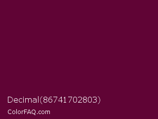 Decimal 86741702803 Color is a very dark rose color and the nearest color is Mulberry Wood #5c0536. Hex code #600435 and RGB value is rgb(96,4,53). In RGB color space, this color is composed of 38% red, 2% green, 21% blue, In CMYK color space, this color is composed of 0% cyan, 96% magenta, 45% yellow , 62% black , In HSL color space, this color has a hue angle of 328° , 92% saturation and 20% lightness.