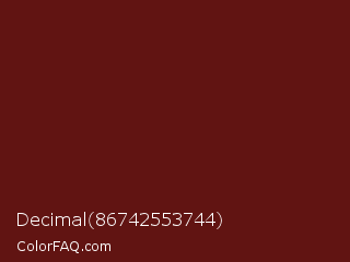 Decimal 86742553744 Color is a dark red color and the nearest color is Dark Tan #661010. Hex code #611412 and RGB value is rgb(97,20,18). In RGB color space, this color is composed of 38% red, 8% green, 7% blue, In CMYK color space, this color is composed of 0% cyan, 79% magenta, 81% yellow , 62% black , In HSL color space, this color has a hue angle of 2° , 69% saturation and 23% lightness.
