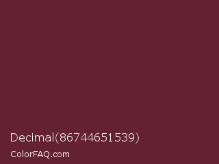 Decimal 86744651539 Color is a dark red color and the nearest color is Wine Berry #591d35. Hex code #642231 and RGB value is rgb(100,34,49). In RGB color space, this color is composed of 39% red, 13% green, 19% blue, In CMYK color space, this color is composed of 0% cyan, 66% magenta, 51% yellow , 61% black , In HSL color space, this color has a hue angle of 346° , 49% saturation and 26% lightness.