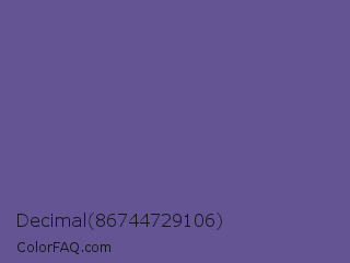 Decimal 86744729106 Color is a normal indigo color and the nearest color is Butterfly Bush #624e9a. Hex code #645494 and RGB value is rgb(100,84,148). In RGB color space, this color is composed of 39% red, 33% green, 58% blue, In CMYK color space, this color is composed of 32% cyan, 43% magenta, 0% yellow , 42% black , In HSL color space, this color has a hue angle of 255° , 28% saturation and 45% lightness.