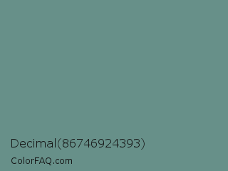 Decimal 86746924393 Color is a normal cyan color and the nearest color is Steel Teal #5f8a8b. Hex code #679089 and RGB value is rgb(103,144,137). In RGB color space, this color is composed of 40% red, 56% green, 54% blue, In CMYK color space, this color is composed of 28% cyan, 0% magenta, 5% yellow , 44% black , In HSL color space, this color has a hue angle of 170° , 17% saturation and 48% lightness.