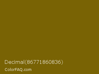 Decimal 86771860836 Color is a dark yellow color and the nearest color is Yukon Gold #7b6608. Hex code #796304 and RGB value is rgb(121,99,4). In RGB color space, this color is composed of 47% red, 39% green, 2% blue, In CMYK color space, this color is composed of 0% cyan, 18% magenta, 97% yellow , 53% black , In HSL color space, this color has a hue angle of 49° , 94% saturation and 25% lightness.