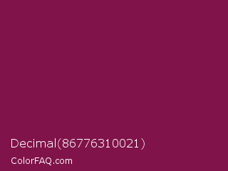 Decimal 86776310021 Color is a dark rose color and the nearest color is Rose Bud Cherry #800b47. Hex code #801349 and RGB value is rgb(128,19,73). In RGB color space, this color is composed of 50% red, 7% green, 29% blue, In CMYK color space, this color is composed of 0% cyan, 85% magenta, 43% yellow , 50% black , In HSL color space, this color has a hue angle of 330° , 74% saturation and 29% lightness.