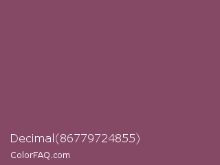 Decimal 86779724855 Color is a normal rose color and the nearest color is Cannon Pink #894367. Hex code #854965 and RGB value is rgb(133,73,101). In RGB color space, this color is composed of 52% red, 29% green, 40% blue, In CMYK color space, this color is composed of 0% cyan, 45% magenta, 24% yellow , 48% black , In HSL color space, this color has a hue angle of 332° , 29% saturation and 40% lightness.