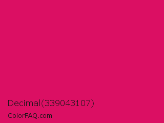 Decimal 339043107 Color is a normal rose color and the nearest color is Ruby #e0115f. Hex code #db0f63 and RGB value is rgb(219,15,99). In RGB color space, this color is composed of 86% red, 6% green, 39% blue, In CMYK color space, this color is composed of 0% cyan, 93% magenta, 55% yellow , 14% black , In HSL color space, this color has a hue angle of 335° , 87% saturation and 46% lightness.
