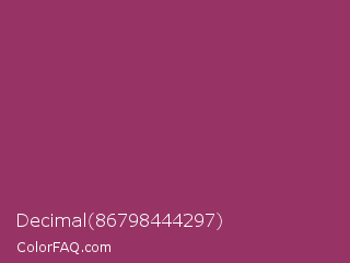 Decimal 86798444297 Color is a normal rose color and the nearest color is Vin Rouge #983d61. Hex code #973465 and RGB value is rgb(151,52,101). In RGB color space, this color is composed of 59% red, 20% green, 40% blue, In CMYK color space, this color is composed of 0% cyan, 66% magenta, 33% yellow , 41% black , In HSL color space, this color has a hue angle of 330° , 49% saturation and 40% lightness.