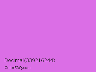 Decimal 339216244 Color is a light magenta color and the nearest color is Orchid #da70d6. Hex code #db6ee6 and RGB value is rgb(219,110,230). In RGB color space, this color is composed of 86% red, 43% green, 90% blue, In CMYK color space, this color is composed of 5% cyan, 52% magenta, 0% yellow , 10% black , In HSL color space, this color has a hue angle of 295° , 71% saturation and 67% lightness.