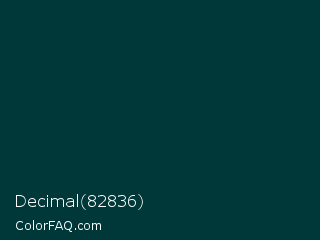 Decimal 82836 Color is a very dark cyan color and the nearest color is Tiber #063537. Hex code #00383a and RGB value is rgb(0,56,58). In RGB color space, this color is composed of 0% red, 22% green, 23% blue, In CMYK color space, this color is composed of 100% cyan, 3% magenta, 0% yellow , 77% black , In HSL color space, this color has a hue angle of 182° , 100% saturation and 11% lightness.