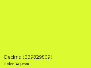 Decimal 339829809 Color is a normal yellow color and the nearest color is Pear #d1e231. Hex code #dbfa2f and RGB value is rgb(219,250,47). In RGB color space, this color is composed of 86% red, 98% green, 18% blue, In CMYK color space, this color is composed of 12% cyan, 0% magenta, 81% yellow , 2% black , In HSL color space, this color has a hue angle of 69° , 95% saturation and 58% lightness.