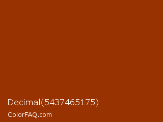 Decimal 5437465175 Color is a dark orange color and the nearest color is Oregon #9b4703. Hex code #983301 and RGB value is rgb(152,51,1). In RGB color space, this color is composed of 60% red, 20% green, 0% blue, In CMYK color space, this color is composed of 0% cyan, 66% magenta, 99% yellow , 40% black , In HSL color space, this color has a hue angle of 20° , 99% saturation and 30% lightness.