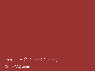 Decimal 5437465349 Color is a normal red color and the nearest color is Stiletto #9c3336. Hex code #983331 and RGB value is rgb(152,51,49). In RGB color space, this color is composed of 60% red, 20% green, 19% blue, In CMYK color space, this color is composed of 0% cyan, 66% magenta, 68% yellow , 40% black , In HSL color space, this color has a hue angle of 1° , 51% saturation and 39% lightness.