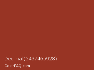 Decimal 5437465928 Color is a normal red color and the nearest color is Prairie Sand #9a3820. Hex code #983424 and RGB value is rgb(152,52,36). In RGB color space, this color is composed of 60% red, 20% green, 14% blue, In CMYK color space, this color is composed of 0% cyan, 66% magenta, 76% yellow , 40% black , In HSL color space, this color has a hue angle of 8° , 62% saturation and 37% lightness.