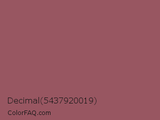 Decimal 5437920019 Color is a normal red color and the nearest color is Au Chico #97605d. Hex code #985661 and RGB value is rgb(152,86,97). In RGB color space, this color is composed of 60% red, 34% green, 38% blue, In CMYK color space, this color is composed of 0% cyan, 43% magenta, 36% yellow , 40% black , In HSL color space, this color has a hue angle of 350° , 28% saturation and 47% lightness.