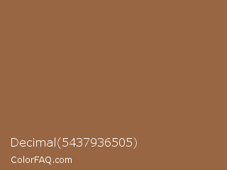 Decimal 5437936505 Color is a normal orange color and the nearest color is Cape Palliser #a26645. Hex code #986643 and RGB value is rgb(152,102,67). In RGB color space, this color is composed of 60% red, 40% green, 26% blue, In CMYK color space, this color is composed of 0% cyan, 33% magenta, 56% yellow , 40% black , In HSL color space, this color has a hue angle of 25° , 39% saturation and 43% lightness.