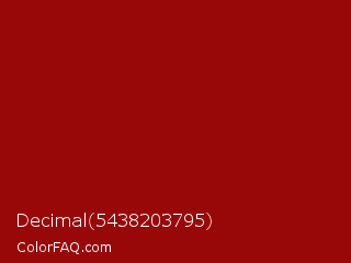 Decimal 5438203795 Color is a normal red color and the nearest color is Sangria #92000a. Hex code #990809 and RGB value is rgb(153,8,9). In RGB color space, this color is composed of 60% red, 3% green, 4% blue, In CMYK color space, this color is composed of 0% cyan, 95% magenta, 94% yellow , 40% black , In HSL color space, this color has a hue angle of 360° , 90% saturation and 32% lightness.