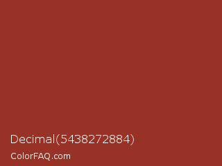 Decimal 5438272884 Color is a normal red color and the nearest color is Prairie Sand #9a3820. Hex code #993226 and RGB value is rgb(153,50,38). In RGB color space, this color is composed of 60% red, 20% green, 15% blue, In CMYK color space, this color is composed of 0% cyan, 67% magenta, 75% yellow , 40% black , In HSL color space, this color has a hue angle of 6° , 60% saturation and 37% lightness.