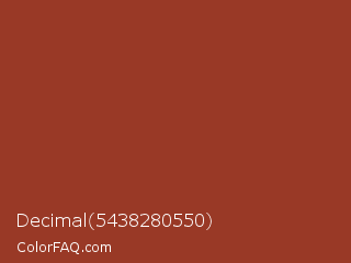 Decimal 5438280550 Color is a normal red color and the nearest color is Prairie Sand #9a3820. Hex code #993926 and RGB value is rgb(153,57,38). In RGB color space, this color is composed of 60% red, 22% green, 15% blue, In CMYK color space, this color is composed of 0% cyan, 63% magenta, 75% yellow , 40% black , In HSL color space, this color has a hue angle of 10° , 60% saturation and 37% lightness.