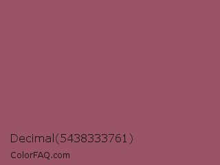 Decimal 5438333761 Color is a normal red color and the nearest color is Au Chico #97605d. Hex code #995465 and RGB value is rgb(153,84,101). In RGB color space, this color is composed of 60% red, 33% green, 40% blue, In CMYK color space, this color is composed of 0% cyan, 45% magenta, 34% yellow , 40% black , In HSL color space, this color has a hue angle of 345° , 29% saturation and 46% lightness.
