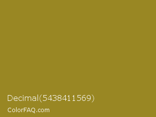 Decimal 5438411569 Color is a normal yellow color and the nearest color is Hacienda #98811b. Hex code #998723 and RGB value is rgb(153,135,35). In RGB color space, this color is composed of 60% red, 53% green, 14% blue, In CMYK color space, this color is composed of 0% cyan, 12% magenta, 77% yellow , 40% black , In HSL color space, this color has a hue angle of 51° , 63% saturation and 37% lightness.