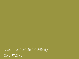 Decimal 5438449988 Color is a normal yellow color and the nearest color is Sycamore #908d39. Hex code #999540 and RGB value is rgb(153,149,64). In RGB color space, this color is composed of 60% red, 58% green, 25% blue, In CMYK color space, this color is composed of 0% cyan, 3% magenta, 58% yellow , 40% black , In HSL color space, this color has a hue angle of 57° , 41% saturation and 43% lightness.