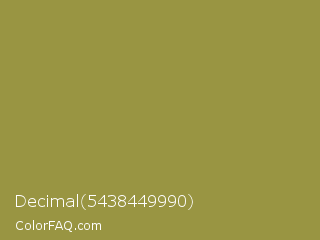 Decimal 5438449990 Color is a normal yellow color and the nearest color is Sycamore #908d39. Hex code #999542 and RGB value is rgb(153,149,66). In RGB color space, this color is composed of 60% red, 58% green, 26% blue, In CMYK color space, this color is composed of 0% cyan, 3% magenta, 57% yellow , 40% black , In HSL color space, this color has a hue angle of 57° , 40% saturation and 43% lightness.