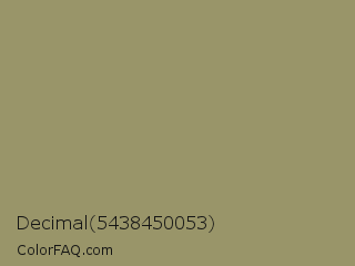 Decimal 5438450053 Color is a normal yellow color and the nearest color is Gurkha #9a9577. Hex code #999569 and RGB value is rgb(153,149,105). In RGB color space, this color is composed of 60% red, 58% green, 41% blue, In CMYK color space, this color is composed of 0% cyan, 3% magenta, 31% yellow , 40% black , In HSL color space, this color has a hue angle of 55° , 19% saturation and 51% lightness.