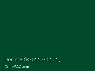 Decimal 87015396101 Color is a very dark green color and the nearest color is British Racing Green #004225. Hex code #004929 and RGB value is rgb(0,73,41). In RGB color space, this color is composed of 0% red, 29% green, 16% blue, In CMYK color space, this color is composed of 100% cyan, 0% magenta, 44% yellow , 71% black , In HSL color space, this color has a hue angle of 154° , 100% saturation and 14% lightness.