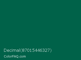 Decimal 87015446327 Color is a very dark cyan color and the nearest color is Bottle Green #006a4e. Hex code #006249 and RGB value is rgb(0,98,73). In RGB color space, this color is composed of 0% red, 38% green, 29% blue, In CMYK color space, this color is composed of 100% cyan, 0% magenta, 26% yellow , 62% black , In HSL color space, this color has a hue angle of 165° , 100% saturation and 19% lightness.
