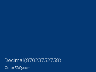 Decimal 87023752758 Color is a dark blue color and the nearest color is Regal Blue #013f6a. Hex code #033874 and RGB value is rgb(3,56,116). In RGB color space, this color is composed of 1% red, 22% green, 45% blue, In CMYK color space, this color is composed of 97% cyan, 52% magenta, 0% yellow , 55% black , In HSL color space, this color has a hue angle of 212° , 95% saturation and 23% lightness.