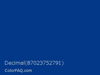 Decimal 87023752791 Color is a dark blue color and the nearest color is Air Force Blue USAF #00308f. Hex code #033889 and RGB value is rgb(3,56,137). In RGB color space, this color is composed of 1% red, 22% green, 54% blue, In CMYK color space, this color is composed of 98% cyan, 59% magenta, 0% yellow , 46% black , In HSL color space, this color has a hue angle of 216° , 96% saturation and 27% lightness.