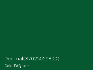 Decimal 87025059890 Color is a very dark green color and the nearest color is Sacramento State Green #00563f. Hex code #055830 and RGB value is rgb(5,88,48). In RGB color space, this color is composed of 2% red, 35% green, 19% blue, In CMYK color space, this color is composed of 94% cyan, 0% magenta, 45% yellow , 65% black , In HSL color space, this color has a hue angle of 151° , 89% saturation and 18% lightness.