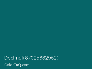 Decimal 87025882962 Color is a very dark cyan color and the nearest color is Mosque #036a6e. Hex code #066568 and RGB value is rgb(6,101,104). In RGB color space, this color is composed of 2% red, 40% green, 41% blue, In CMYK color space, this color is composed of 94% cyan, 3% magenta, 0% yellow , 59% black , In HSL color space, this color has a hue angle of 182° , 89% saturation and 22% lightness.