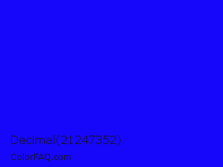 Decimal 21247352 Color is a normal indigo color and the nearest color is Blue #0000ff. Hex code #1606fa and RGB value is rgb(22,6,250). In RGB color space, this color is composed of 9% red, 2% green, 98% blue, In CMYK color space, this color is composed of 91% cyan, 98% magenta, 0% yellow , 2% black , In HSL color space, this color has a hue angle of 244° , 96% saturation and 50% lightness.